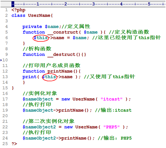 上面的类分别在6行和13行使用了this指针,那么当时this是指向谁呢?其实this是在实例化的时候来确定指向谁,比如第一次实例化对象 的时候(17行),那么当时this就是指向$nameObject对象,那么执行19行的打印的时候就把print( $this->name )变成了print( $nameObject->name ),那么当然就输出了"itcast"。第二个实例的时候,print( $this->name )变成了print( $nameObject2->name ),于是就输出了"PHP5"。所以说,this就是指向当前对象实例的指针,不指向任何其他对象或类。